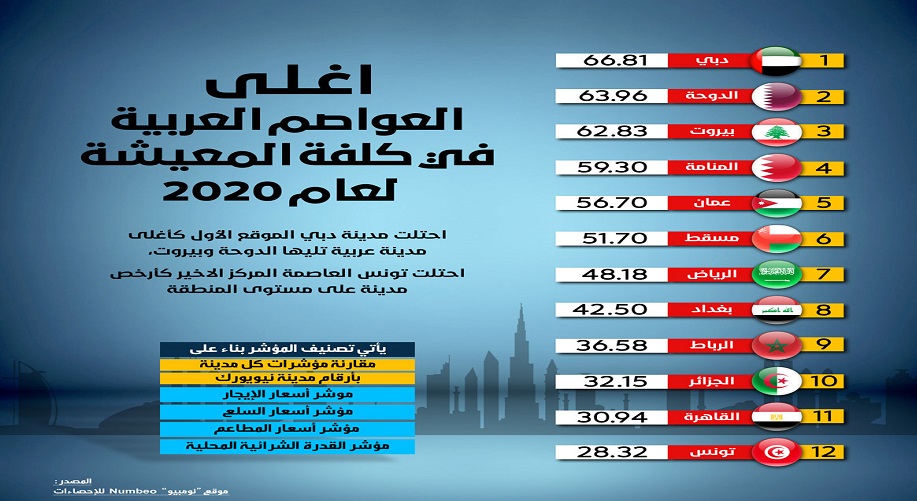 أن مدينة دبي الإماراتية احتلت الموقع الأول كأغلى عاصمة عربية تليها الدوحة وبيروت، بينما أتت تونس العاصمة كأرخص مدينة على مستوى المنطقة العربية.