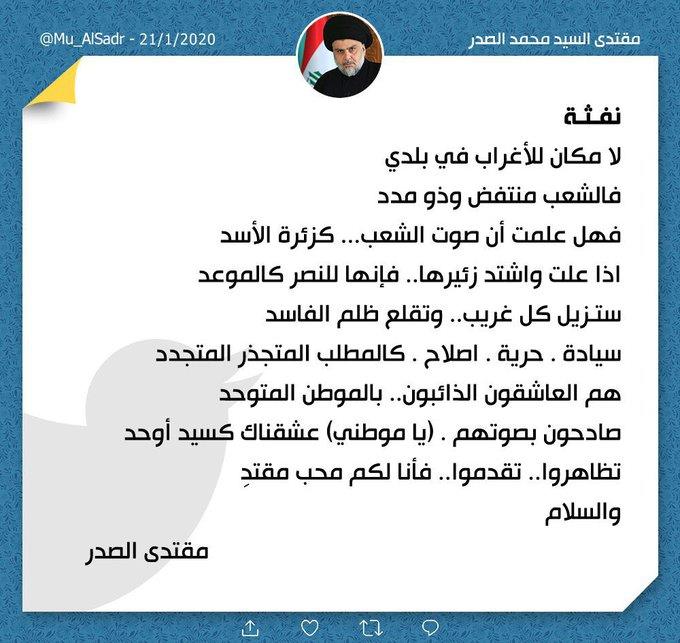 وذكر الصدر في تغريدة على حسابه بموقع تويتر (21 كانون الثاني 2020)، انه انه "لا مكان للأغراب في بلدي، فالشعب منتفض وذو مدد فهل علمت أن صوت الشعب كزئرة الاسد، اذا علت واشتد زئريها فأنها للنصر كالموعد، ستزيل كل غريب، وتقلع ظلم الفاسد".