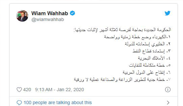 وكتب وئام وهاب عبر "تويتر" : "الحكومة الجديدة بحاجة لفرصة ثلاثة أشهر لإثبات جديتها: