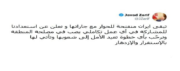 وكتب ظريف في تغريدة باللغة العربية على صفحته الخاصة في موقع تويتر: "تبقی ايران منفتحة للحوار مع جاراتها ونعلن عن استعدادنا للمشارکة في أي عمل تکاملي يصب في مصلحة المنطقة.