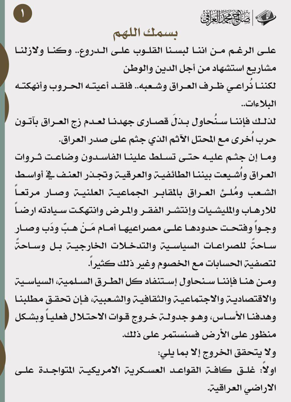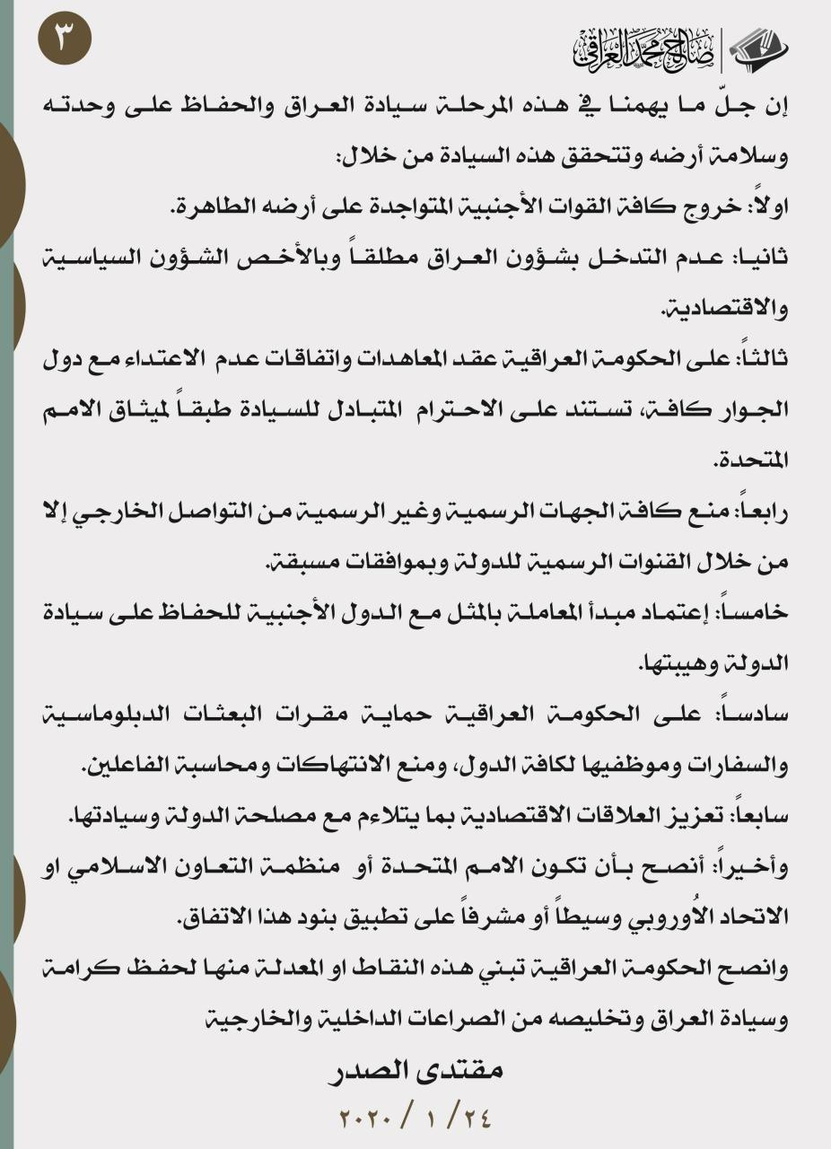 وفي ما يلي نص البيان الصادر عن زعيم التيار الصدري: