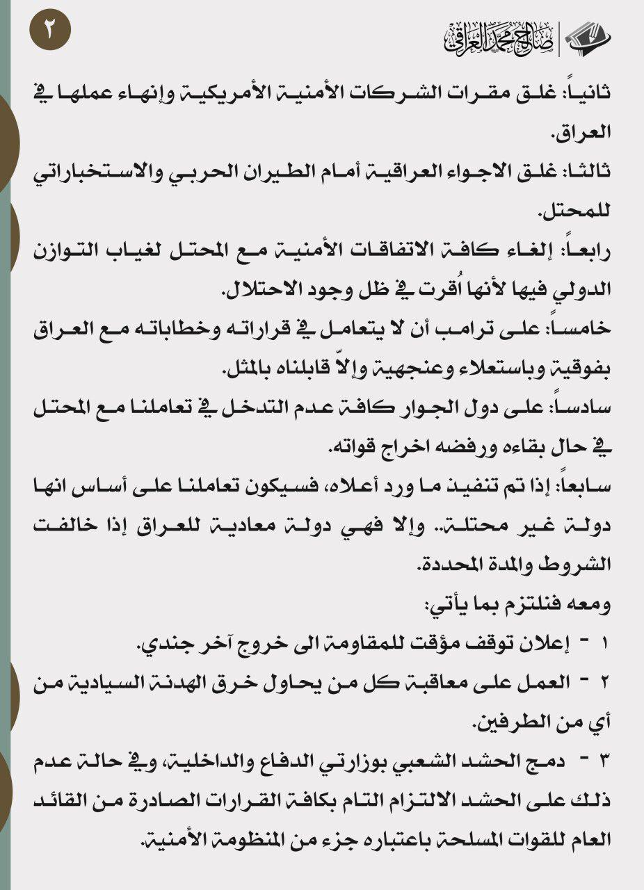وأكد انه "سيتم التعامل مع الولايات المتحدة كدولة محتلة ومعادية إذا رفضت الخروج من العراق".