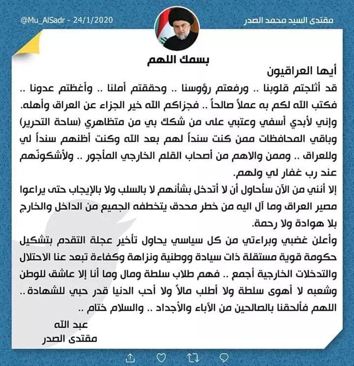 واعرب الصدر في تغريدة له الجمعة عن اسفه وعتبه على "من شكك بي من متظاهري (ساحة التحرير) وباقي المحافظات ممن كنت سنداً لهم بعد الله وكنت اظنهم سنداً لي وللعراق.. وممن والاهم من أصحاب القلم الخارجي المأجور.. ولأشكونّهم عند رب غفار لي ولهم".