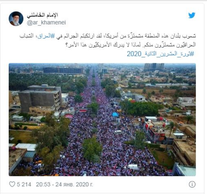 وجاء في تغريدة نشرت على موقع مكتب القائد مساء الجمعة، موجهة للولايات المتحدة ان : "شعوب بلدان هذه المنطقة مشمئزة من أمريكا، لقد ارتكبتم جرائم في العراق".