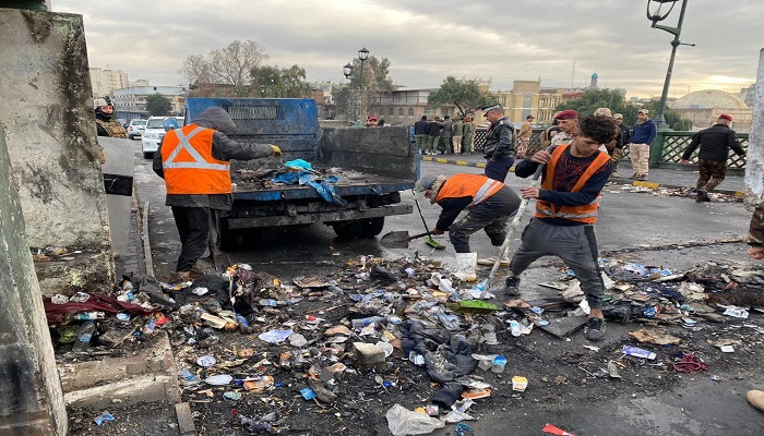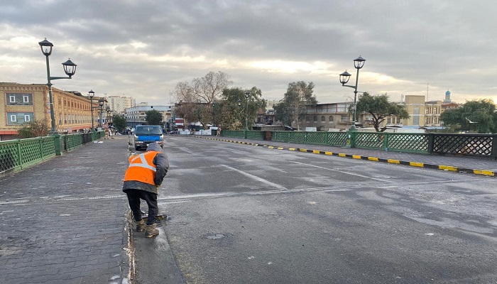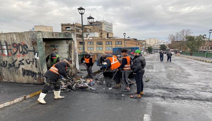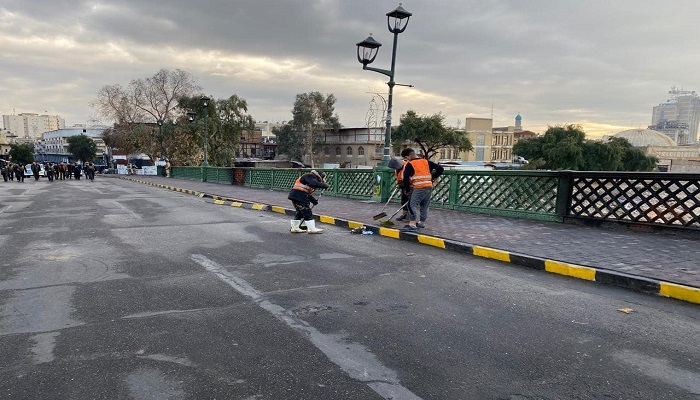 العراق-الكوثر: بعد رفع الكتل الكونكريتية من ساحة الخلاني وسط العاصمة العراقية بغداد ، فيما بدات كوادر امانة بغداد تباشر بحملة لتنظيف وغسل جسر الاحرار بعد رفع الكتل الكونكريتية عنه واعادة فتحه من قبل القوات الأمنية .