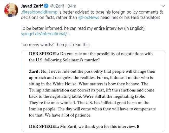 يشار الى ان الرئيس الامريكي دونالد ترامب الذي بات معروفا في الاوساط الاعلامية بالكذاب كان قد زعم في تغريدة له امس نقلا عن ظريف قوله " وزير الخارجية الإيراني يقول إن بلاده تريد إجراء مفاوضات معنا لكنها ترغب في رفع العقوبات.. لا شكرا " .