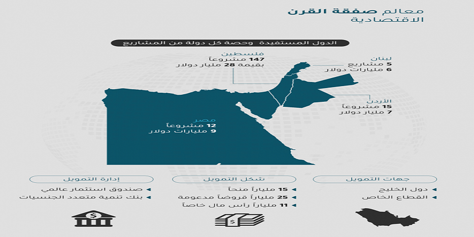 وتقترح "صفقة القرن" 50 مليار دولار لتمويل المشروعات في المناطق المخصصة لإقامة الدولة الفلسطينية، فيما قالت الصحيفة العبرية إن ولي العهد السعودي محمد بن سلمان سيكون ضمن آخرين بالخليج تعهدوا أمام إدارة ترامب بتوفير المبلغ المطلوب.
