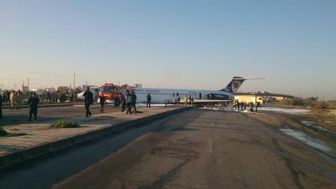 وقال المتحدث باسم منظمة الطيران المدني الايراني رضا جعفر زادة في تصريح ادلى به لمراسل وكالة انباء "فارس" ان طائرة "بوينغ ام دي" انحرفت عن مدرج مطار مدينة ماهشهر.