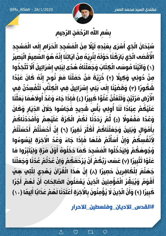 وأورد مقتدى الصدر، تغريدة عبر منصة تويتر، تضمنت 10 آيات من سورة الإسراء، ذيلها بوسم #القدس_للأديان_وفلسطين_للأحرار.