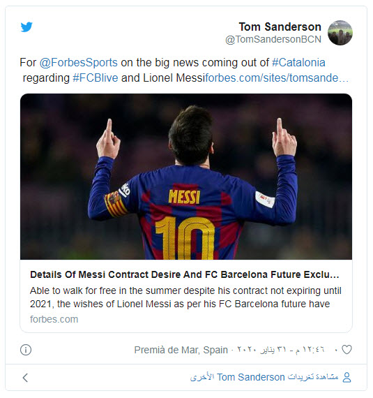 أكد موقع "forbes" أن ميسي، الذي ينتهي عقده الحالي مع برشلونة في 2021، يريد التجديد لعام إضافي فقط.
