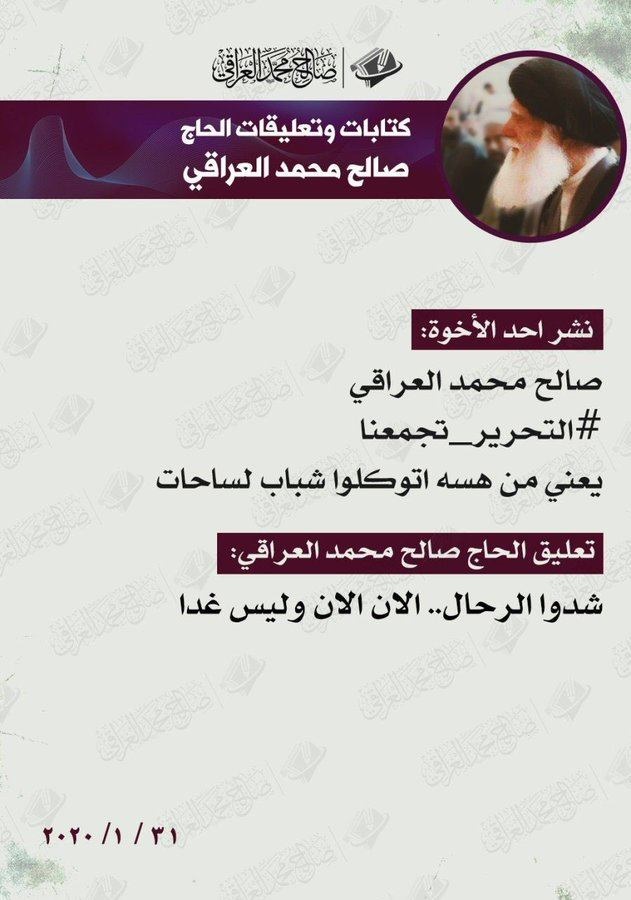 وذكر العراقي في بيان ردا على سؤال احد اتباع التيار الصدري حول موعد الذهاب الى ساحة التحرير امس الجمعة (31 كانون الثاني 2020)، انه "نشر احد الاخوة #التحرير يجمعنا، يعني من هسه اتوكلوا شباب لساحات".