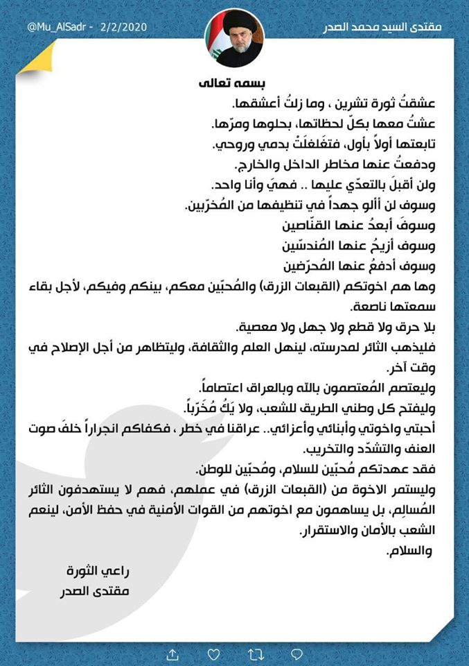وقال الصدر في تغريدة على صفحته في "تويتر" :"عشقت ثورة تشرين، وما زلت أعشقها، عشت معها بكل لحظاتها، بحلوها ومرها، تابعتها أولاً بأول، فتغلغلت بدمي وروحي، ودفعت عنها مخاطر الداخل والخارج، ولن أقبل بالتعدي عليها.. فهيّ وأنا واحد، وسوف لن أألو جهداً في تنظيفها من المُخرّبين".