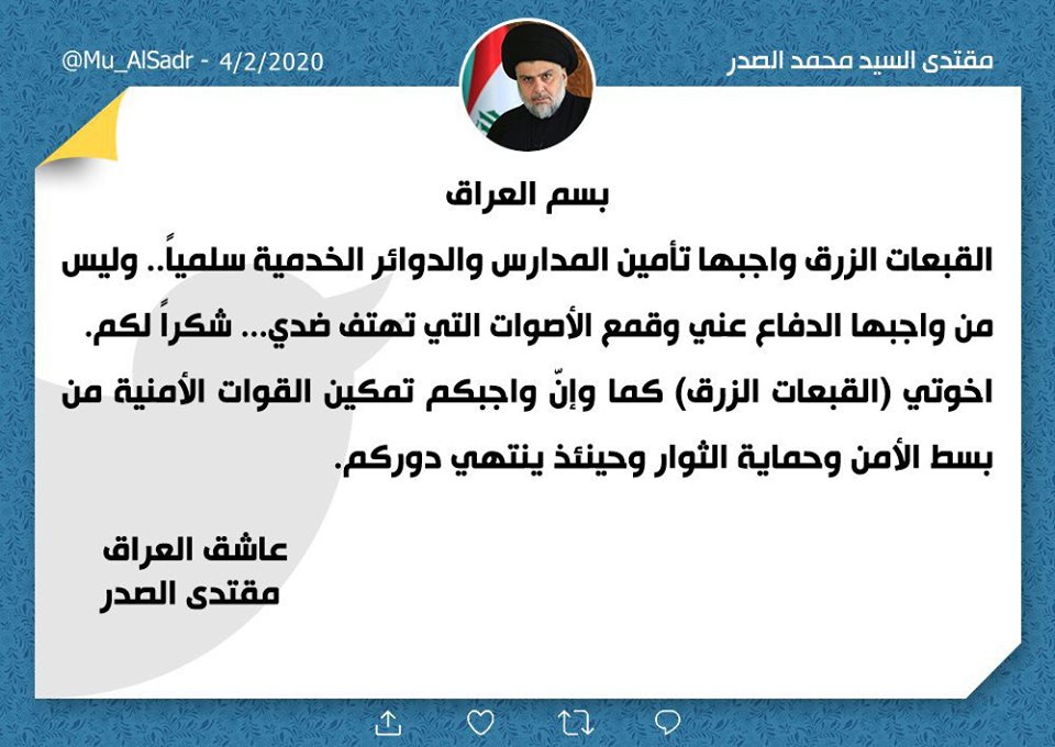 وقال الصدر في تغريدة على موقع (تويتر)، إن "القبعات الزرق واجبها تأمين المدارس والدوائر الخدمية سلمياً، وليس من واجبها الدفاع عني وقمع الأصوات التي تهتف ضدي.. شكراً لكم".