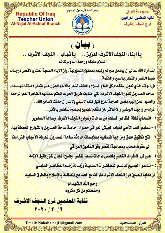واكدت ان "نقابة المعلمين فرع النجف الاشرف مازالت مع الجماهير المطالبة بالإصلاح بالطرق السلمية".