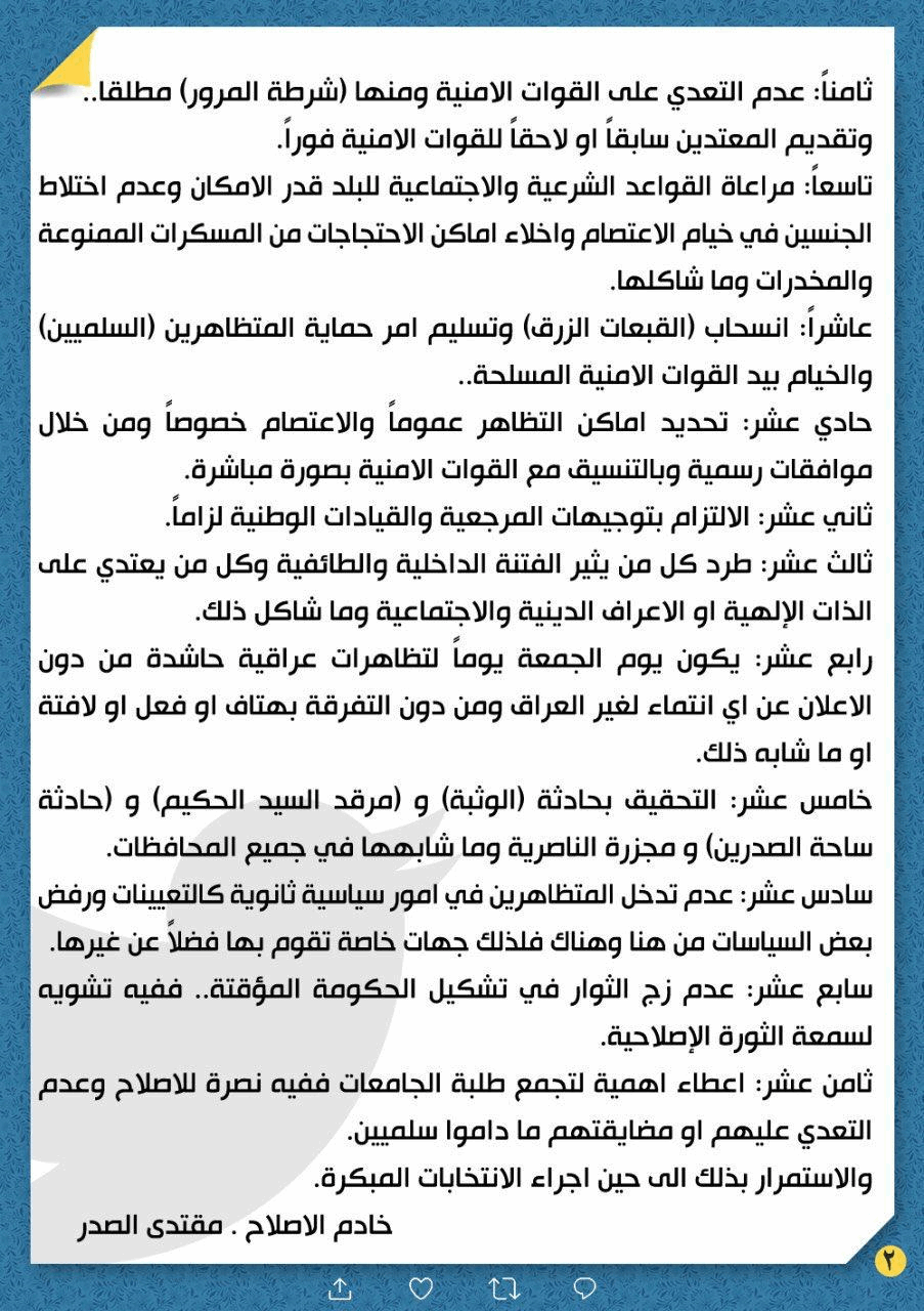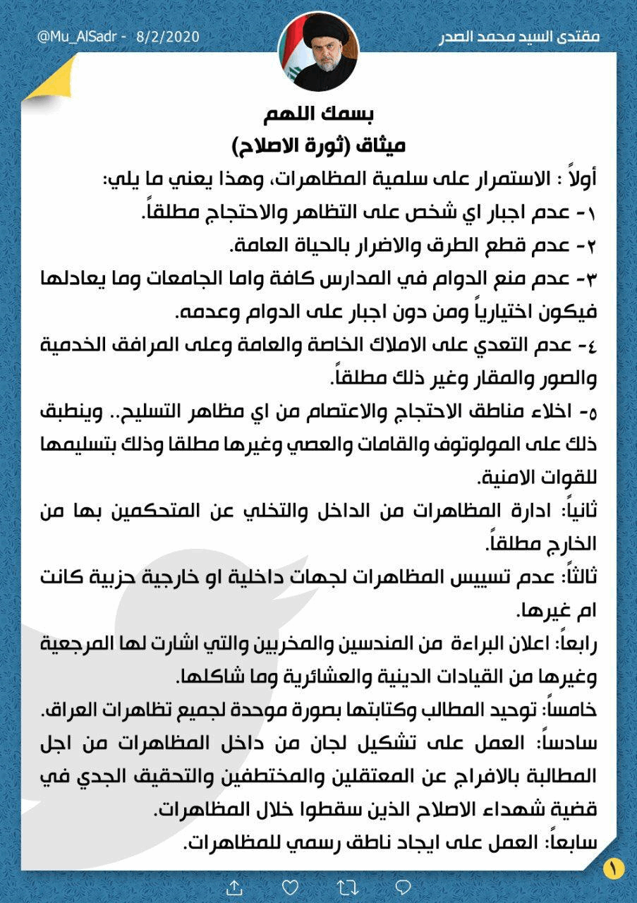 اعلن زعيم التيار الصدري مقتدى الصدر، السبت، عن ما أسماه ميثاق "ثورة الاصلاح"، وفيما دعا الى انسحاب (القبعات الزرق) وتسليم امر حماية المتظاهرين السلميين والخيام بيد القوات الامنية، طالب بأن يكون يوم الجمعة يوما لتظاهرات عراقية حاشدة.