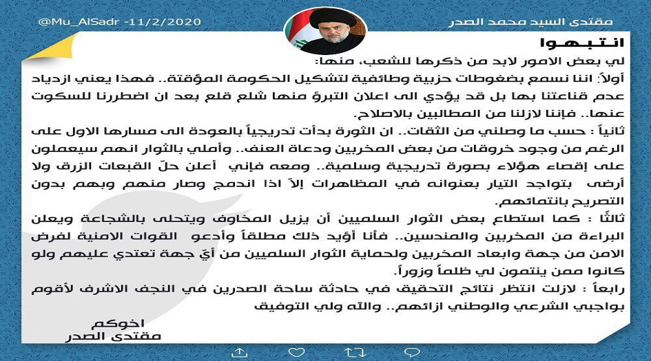 وجاءت تغريدة السيد الصدر على النحو التالي: