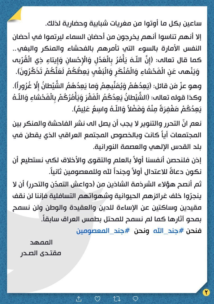 وقال الصدر في تغريدة له، "بالأمس تعالت أصوات التشدد والقتل وحر الرقاب والتفخيخ بإسم الدين، واليوم تتعالى أصوات التحرر والتعري والاختلاط والثمالة والفسق والفجور، بل والكفر والتعدي على الذات الإلهية وإسقاط الأسس الشرعية والأديان السماوية والتعدي على الأنبياء والمرسلين والمعصومين صلوات الله عليهم أجمعين"، مبينا "ذكرني ذلك بشعارهم القديم بما معناه: إنهم لا يريدون (قندهار) بل يريدون (شيكاغو)".