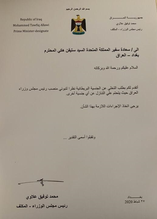 واظهرت وثيقة، تقديم علاوي طلبًا إلى سفير المملكة المتحدة ستيفن هكي للتخلي عن جنسيته البريطانية بسبب تبوئه منصب رئيس وزراء العراق.