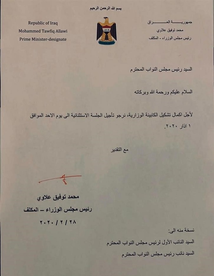 وجاء في الطلب الموجه من علاوي الى رئاسة البرلمان، انه "لاجل اكمال تشكيل الكابنية الوزارية، نرجو تأجيل الجلسة الاستثنائية الى يوم الاحد المقبل، الموافق 1 اذار 2020".