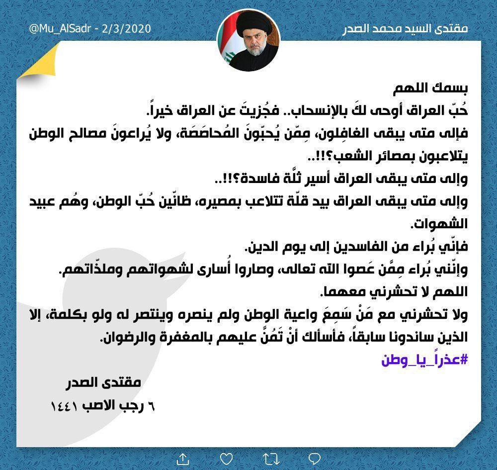 وفي تغريدة له على تويتر، اعتبر السيد الصدر اعتذار علاوي عن تشكيل الحكومة، نابعا عن حبه للعراق، مؤكدا براءته من الفاسدين الذين قال إنهم يتلاعبون بمصائر الشعب العراقي.