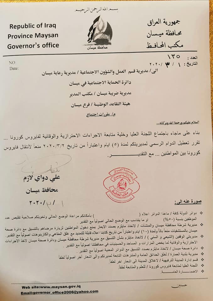إلى ذلك، قرر محافظ ميسان، علي دواي، امس، تعطيل الدوام الرسمي في عدد من دوائر المحافظة لمدة 5 أيام اعتبارا من اليوم(2 آذار 2020)، منعا لانتقال فيروس "كورونا" بين المواطنين.