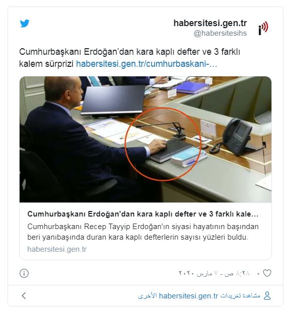 ووفقا لوكالة “نيو ترك بوست” يحضر أردوغان جميع لقاءاته المهمة مع هذا الدفتر ذو الغلاف الأسود لتدوين ملاحظاته فيه ومتابعة التطورات من خلال سؤال وزراءه عن الملاحظات التي سجلها في وقت لاحق مستعيناً بالدفتر.