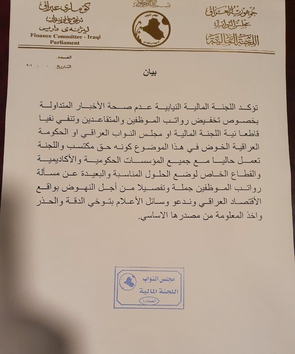 العراق- الكوثر: اصدرت اللجنة المالية النيابية العراقية توضيحا بشأن الاخبار المتدوالة بخصوص تخفض رواتب الموظفين والمتقاعدين.