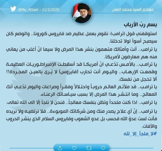 وأضاف الصدر: "يا ترامب.. أنت وأمثالك متهمون بنشر هذا المرض ولا سيما أن أغلب من يعاني منه هم معارضون لأمريكا. يا ترامب.. بالأمس تدعي ان أمريكا قد أسقطت الإمبراطوريات العظيمة وقمعت الإرهاب.. واليوم أنت تحارب (فايروس لا يرى بالعين المجردة!! ألا تخجل من نفسك").