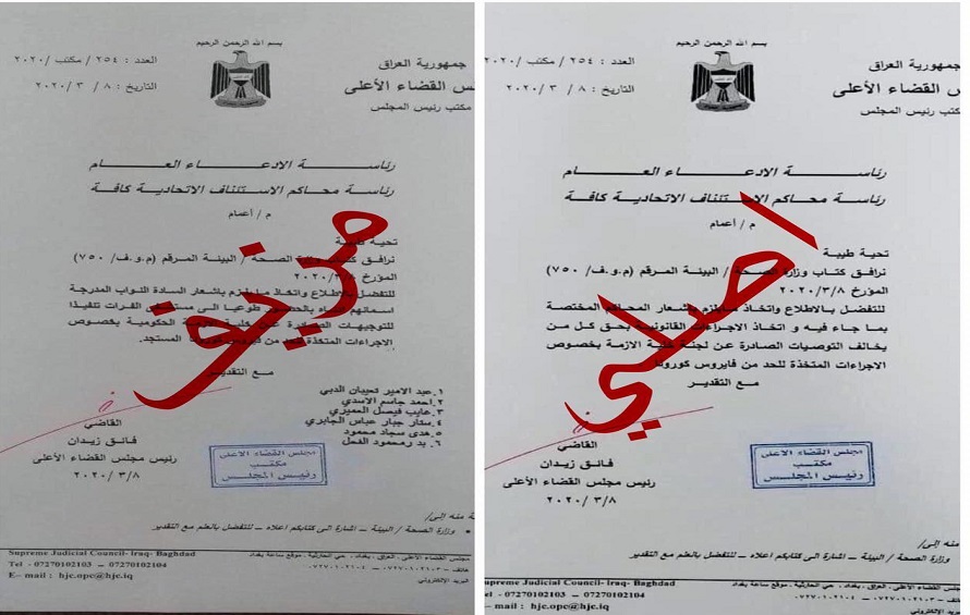 وأظهر المجلس وثيقتين إحداهما الاصلية الصادرة من القضاء، وأخرى مزورة تداولتها وسائل الاعلام والتي تحتوي اشعار النواب بالاجراءات.