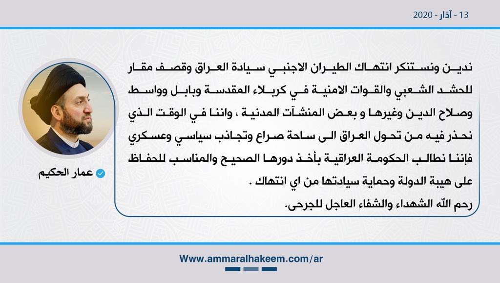 وغرد الحكيم عبر صفحته على توتير قائلا ،"ندين ونستنكر انتهاك الطيران الاجنبي سيادة العراق وقصف مقار للحشد الشعبي والقوات الامنية في كربلاء المقدسة وبابل وواسط وصلاح الدين وغيرها و بعض المنشآت المدنية ".