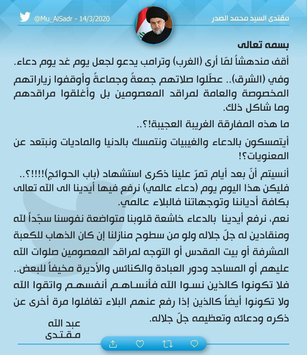 وعبر السيد مقتدى الصدر في تغريدة نشرها على تويتر عن اندهاشه لهذه الدعوة في وقت عطل الشرق صلواتهم وزياراتهم واغلقوا مراقدهم.