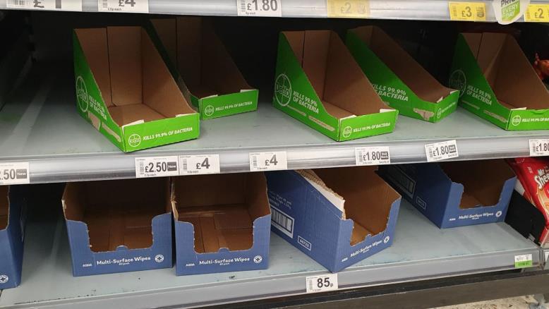 وفرضت سلسلة متاجر "تيسكو" -أحد أكبر المتاجر في البلاد- قيودا على شراء خمسة منتجات، وهي المعكرونة، والمناديل المعقمة، وصابون غسل الأيدي، والحليب المبستر، والبخاخات المزيلة للبكتيريا، وأكدت الشركة أنه ستحدد عدد القطع المسموح بها لكل زبون، وقد تشرع في عملية الطلب المسبق عبر الإنترنت قبل الحصول عليها في المتجر.