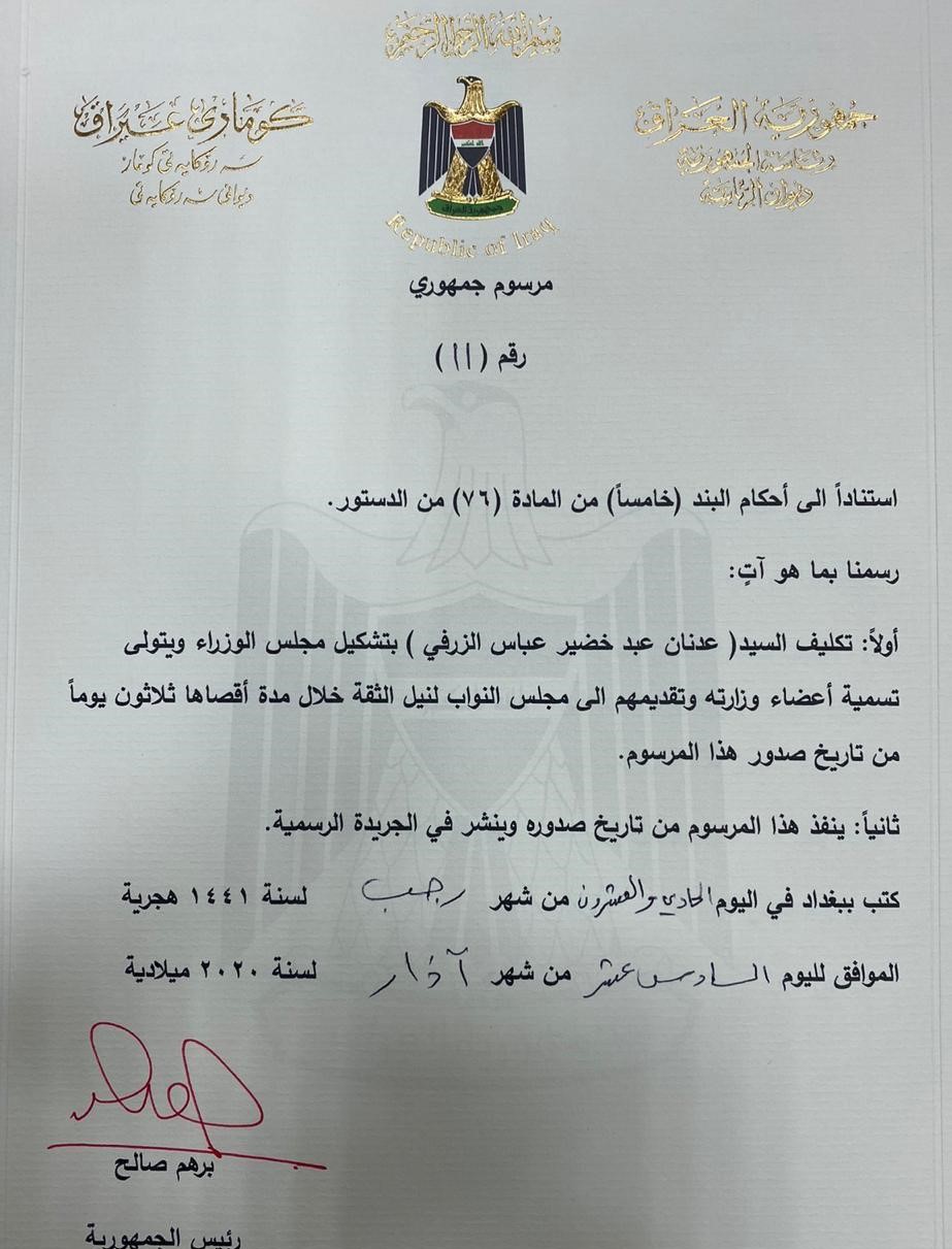 وأفادت مصادر اعلامية عراقية ان التكليف قد تم بحضور رئيس المحكمة الاتحادية مدحت المحمود ورئيس مجلس القضاء الاعلى فائق زيدان ورئيس البرلمان محمد الحلبوسي.