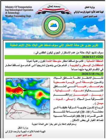واضافت ان "الطقس سيكون ليوم الاربعاء في كافة مناطق البلاد وستكون متوسطة الى غزيرة مصحوبة بعواصف رعدية في المناطق الشمالية دهوك والسليمانية واربيل والموصل وفي الاقسام الشرقية من ديالى والكوت وميسان".