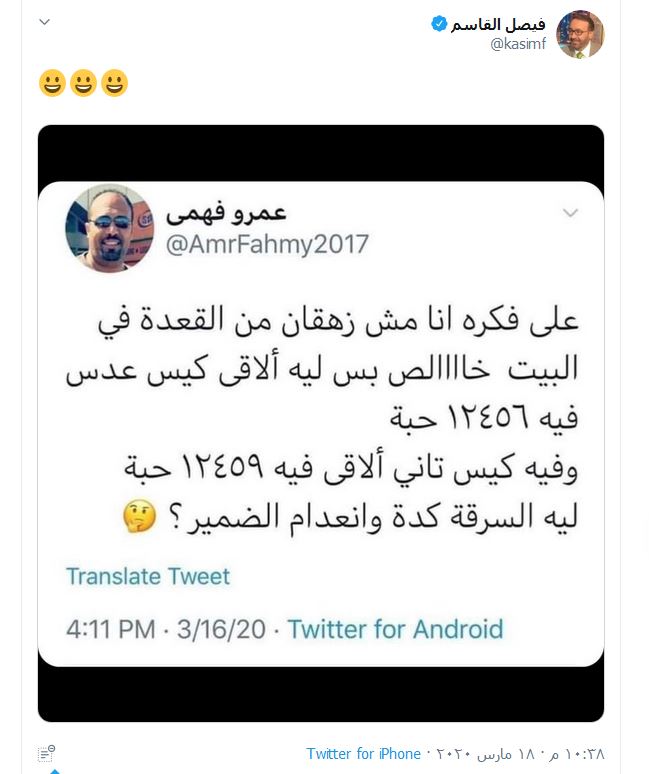 اعاد الاعلامي المثير للجدل فيصل القاسم نشر تغريدة ساخرة عن الملل الذي يعاني منه المواطنون العرب وهم مجبورون بالبقاء في منازلهم في محاولة لمنع تفشي فيروس كورونا المستجد (كوفيد 19) في بلدانهم.