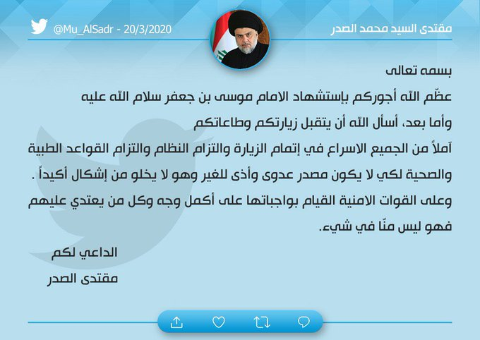 وكانت خلية الازمة التابعة لوزارة الصحة العراقية قد اطلقت مناشدة لمراجع الدين والوجهاء والنخب الاكاديمية للتدخل العاجل لايقاف حركة المواطنين لأي ظرف كان، وذلك بعد ارتفاع عدد الاصابات المؤكدة بفيروس كورونا الى 193 اصابة.
