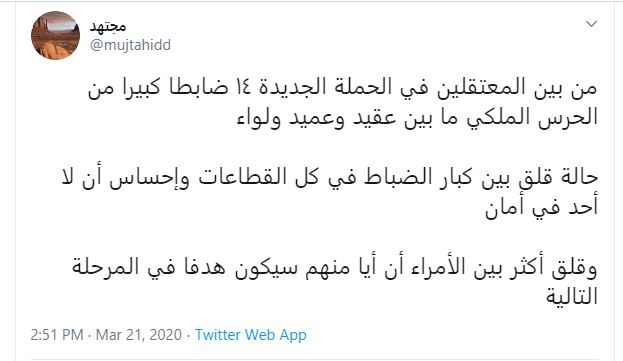 وقال في تغريدة له على موقع التواصل الاجتماعي “تويتر”، ان "من بين المعتقلين في الحملة الجديدة ١٤ ضابطا كبيرا من الحرس الملكي ما بين عقيد وعميد ولواء، مشيرا الى وجود حالة قلق بين كبار الضباط في كل القطاعات وإحساس أن لا أحد في أمان".