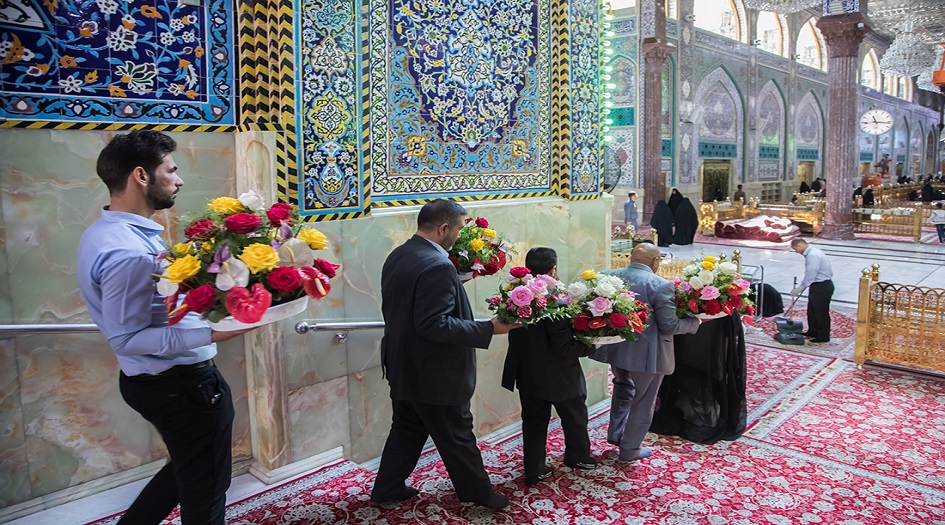 شاهد لحظة دخول اكاليل الورود الى مرقد الامام الحسين(ع) بمناسبة ولادته المباركة
