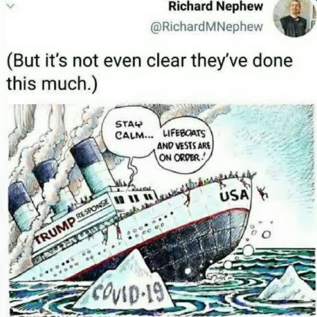 وجاء في الكاريكاتير، عندما تغرق السفينة (وهي تمثل الولايات المتحدة ) في أزمة تفشي كورونا ، يتم سماع صرخات من داخل السفينة:
