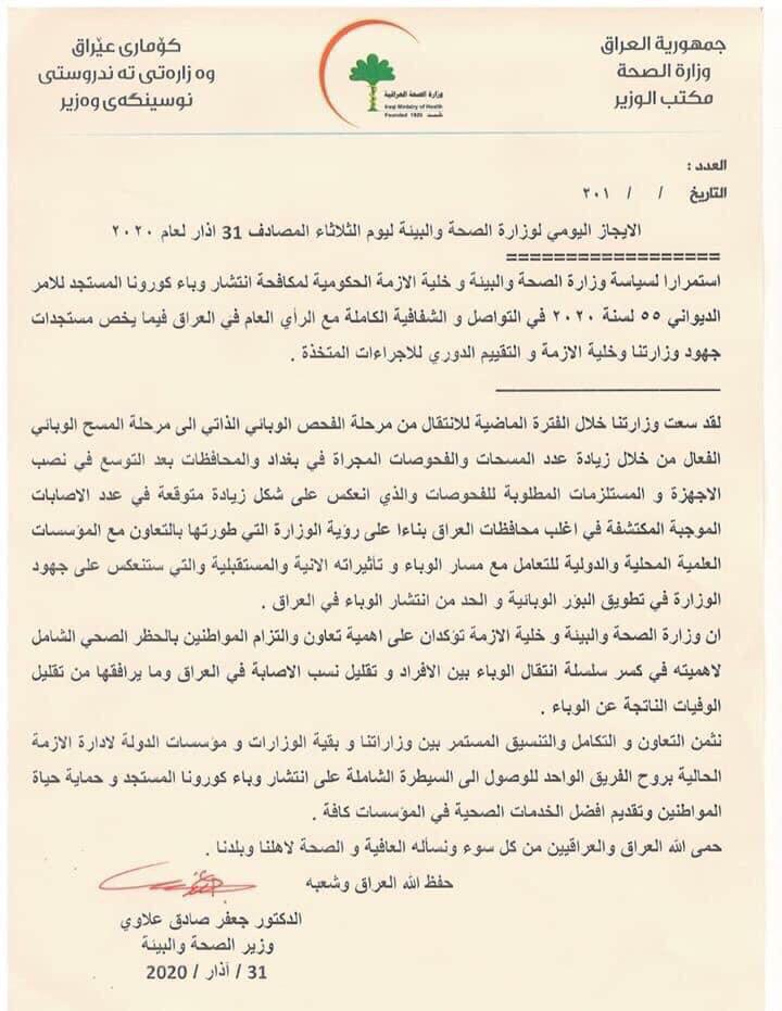 وبحسب البيان الموقع من الوزير جعفر علاوي فقد انتقلت، وزارته من مرحلة "الفحص الوبائي الذاتي" الى مرحلة "المسح الوبائي الفعال" من خلال زيادة عدد المسحات والفحوصات المجراة في بغداد والمحافظات، والذي انعكس على شكل زيادة متوقعة في عداد الاصابات.