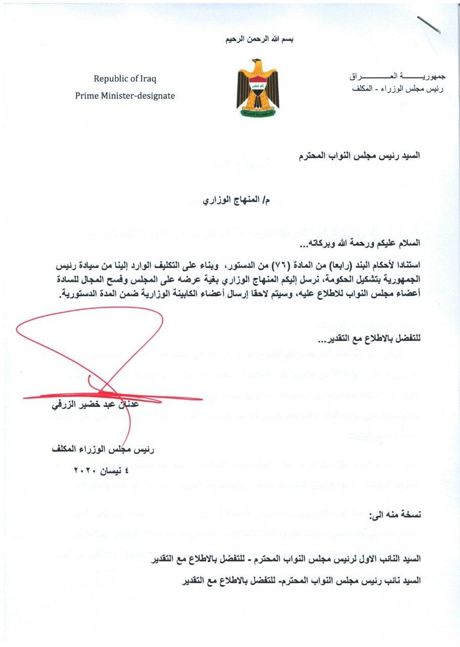 وذكر الزرفي في وثيقة، أنه "استناداً لأحكام البند رابعاً من المادة 76 من الدستور، وبناء على التكليف الوارد الينا من رئيس الجمهورية بتشكيل الحكومة، نرسل إليكم المنهاج الوزاري، بغية عرضه على المجلس وفسح المجال للسادة اعضاء مجلس النواب للاطلاع عليه". وأضافت الوثيقة، أنه "سيتم لاحقاً إرسال اعضاء الكابينة الوزارية ضمن المدة الدستورية".