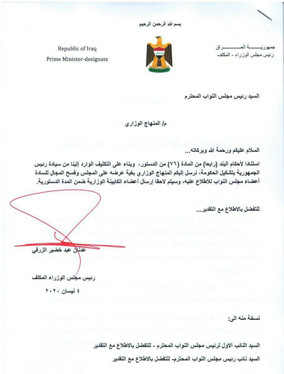 وذكر الزرفي في وثيقة، أنه "استناداً لأحكام البند رابعاً من المادة 76 من الدستور، وبناء على التكليف الوارد الينا من رئيس الجمهورية بتشكيل الحكومة، نرسل إليكم المنهاج الوزاري، بغية عرضه على المجلس وفسح المجال للسادة اعضاء مجلس النواب للاطلاع عليه".