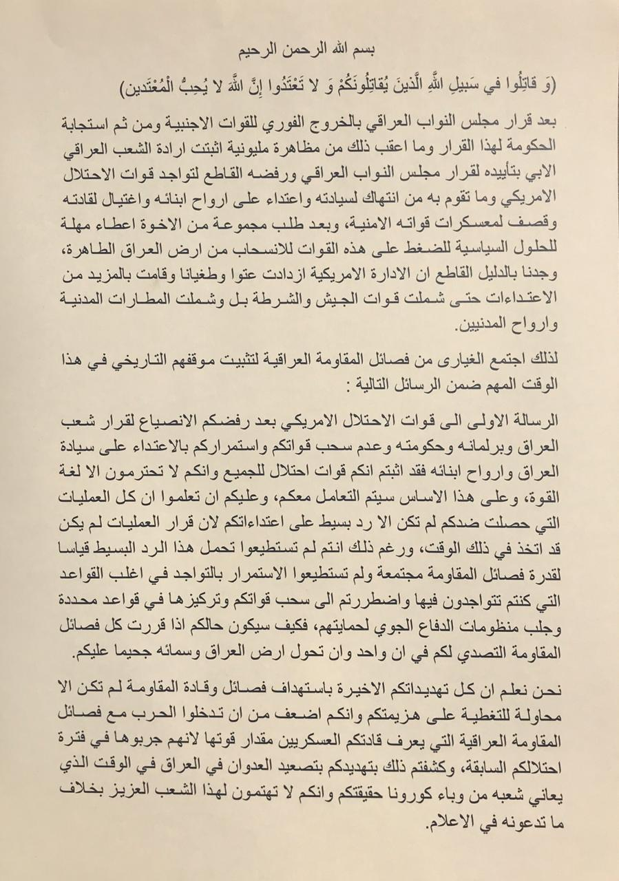 وتضمن البيان المشترك الصدر عن حركة عصائب أهل الحق، والأوفياء، وجند الإمام، والنجباء، وكتائب سيد الشهداء، والإمام علي، وسرايا عاشوراء، والخراساني، ثلاث رسائل، الأولى موجهة إلى القوات الامريكية، حيث سيتم التعامل مع الأخيرة بـ"لغة القوة"، لافتة إلى أن "العمليات التي حصلت لم تكن الا ردا بسيطا".