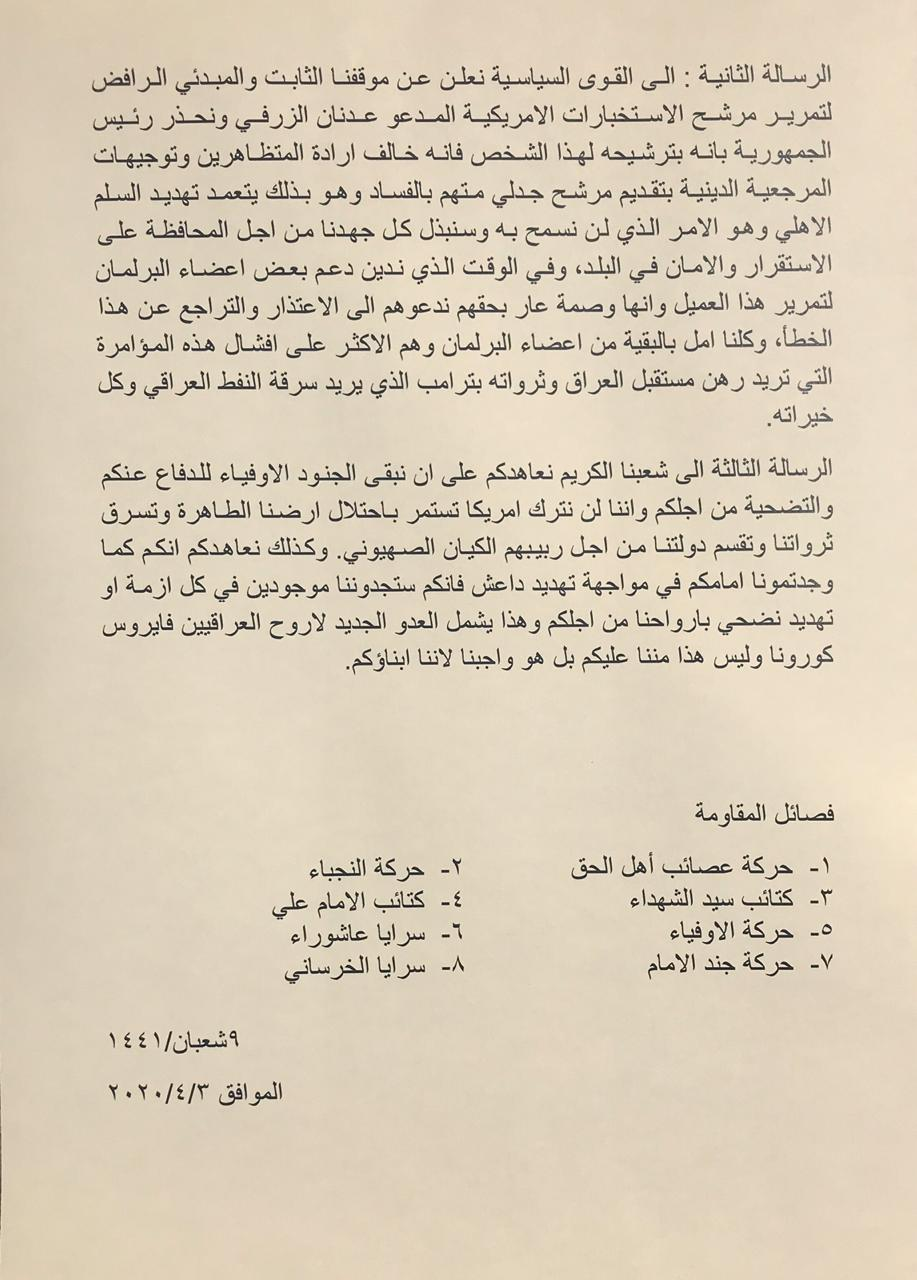 والرسالة الثانية التي وجهها البيان إلى الكتل السياسية، والتي بحسبها أعلنت الفصائل عن موقفها "الثابت والمبدئي الرافض لتمرير مرشح الانتخابات الأمريكية، عدنان الزرفي".