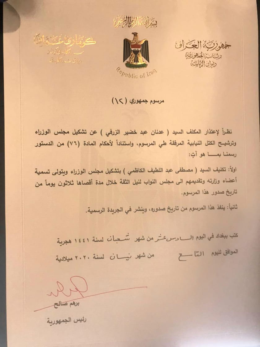 العراق_الكوثر: كلف الرئيس العراقي برھم صالح، الخميس، رسميا، رئيس جھاز المخابرات، مصطفى الكاظمي بتشكيل الحكومة الجديدة وذلك بعد اعتذار الزرفي عن التكليف.