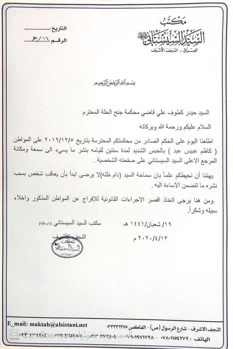 وجاء في وثيقة صادرة من مكتب المرجع الديني الاعلى السيد علي السيستاني بأن المرجع لا يرضى بأن يعاقب شخص بسبب نشره ما تضمن الاساءة لمكانة المرجع، مطالبا بالافراج عنه.