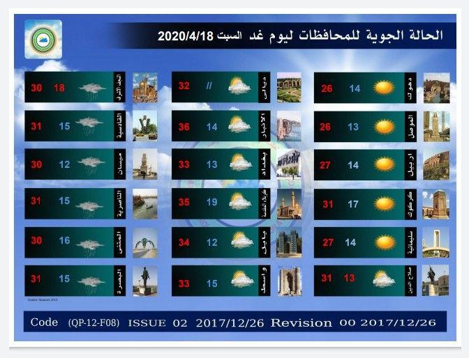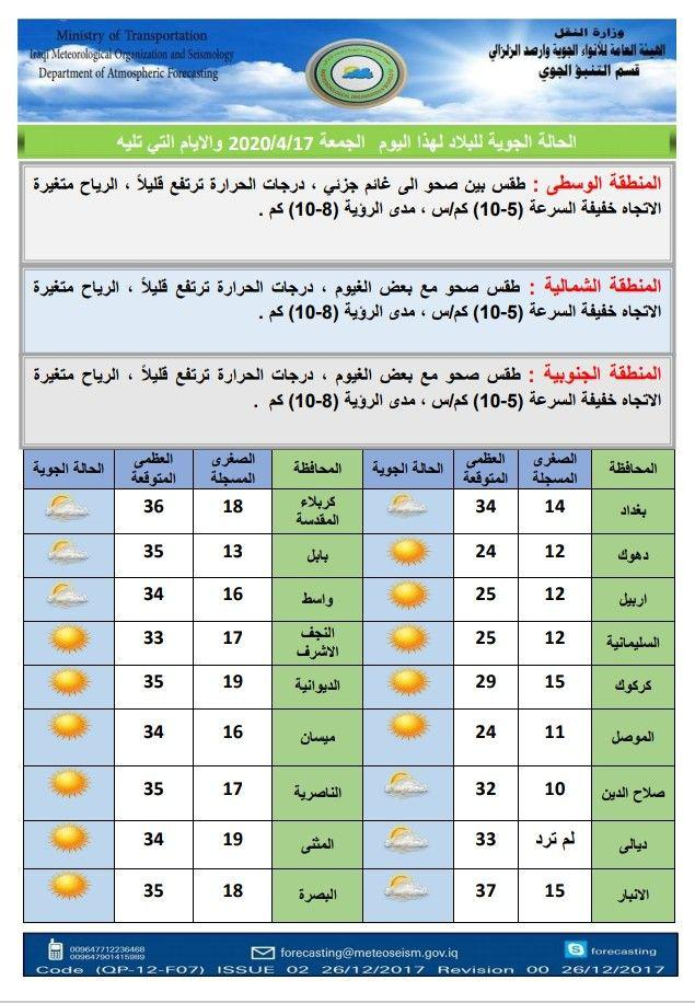 توقعت هيئة الأنواء الجوية والرصد الزلزالي في العراق، الحالة الجوية لليوم، الجمعة، والايام الاربعة المقبل، فيما اشارت الى أن طقس الأيام الأربعة سيكوا صحوا وغائم جزئياً احيانا في وسط وجنوب البلاد.