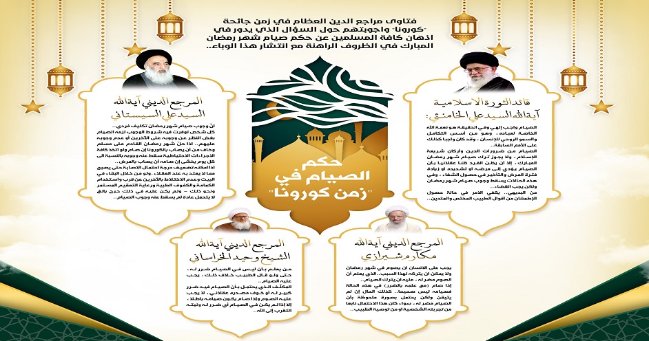 العالم الاسلامي-الكوثر: يوضح انفوغرافيك هذا اليوم فتاوى مراجع الدين العظام في زمن جائحة "كورونا" واجوبتهم حول السؤال الذي يدور في اذهان كافة المسلمين عن حكم صيام شهر رمضان المبارك في الظروف الراهنة مع انتشار هذا وباء كورونا الذي لف الكرة الارضية..