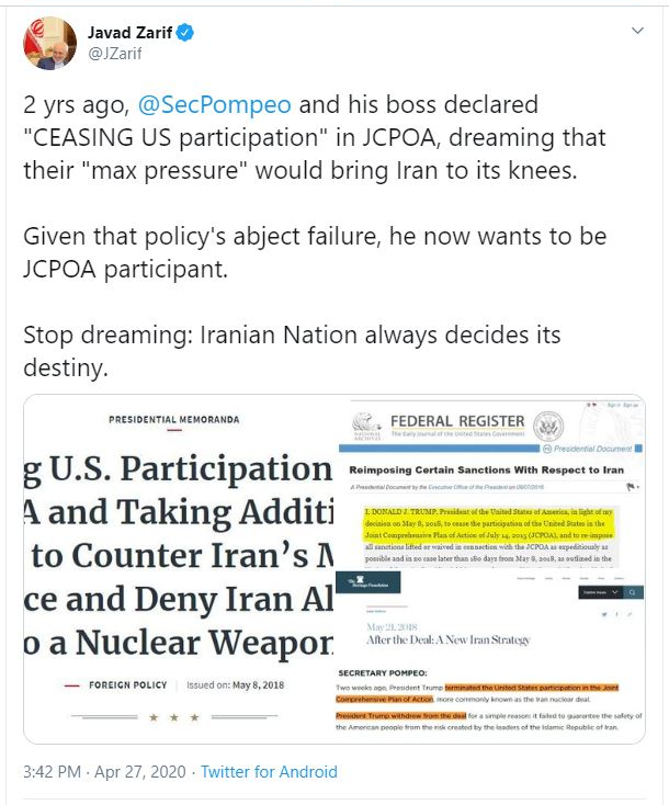 واشار ظريف الى فشل حملة الضغوط القصوى والحظر الاميركي على ايران، قائلا: بعد الفشل الذريع لهذه السياسة، ، فانه (بومبيو) يريد مرة اخرى العودة الى خطة العمل المشتركة الشاملة.