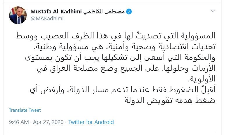 وقال الكاظمي في تغريدة ، إن "المسؤولية التي تصديتُ لها في هذا الظرف العصيب ووسط تحديات اقتصادية وصحية وأمنية، هي مسؤولية وطنية والحكومة التي أسعى إلى تشكيلها يجب أن تكون بمستوى الأزمات وحلولها".
